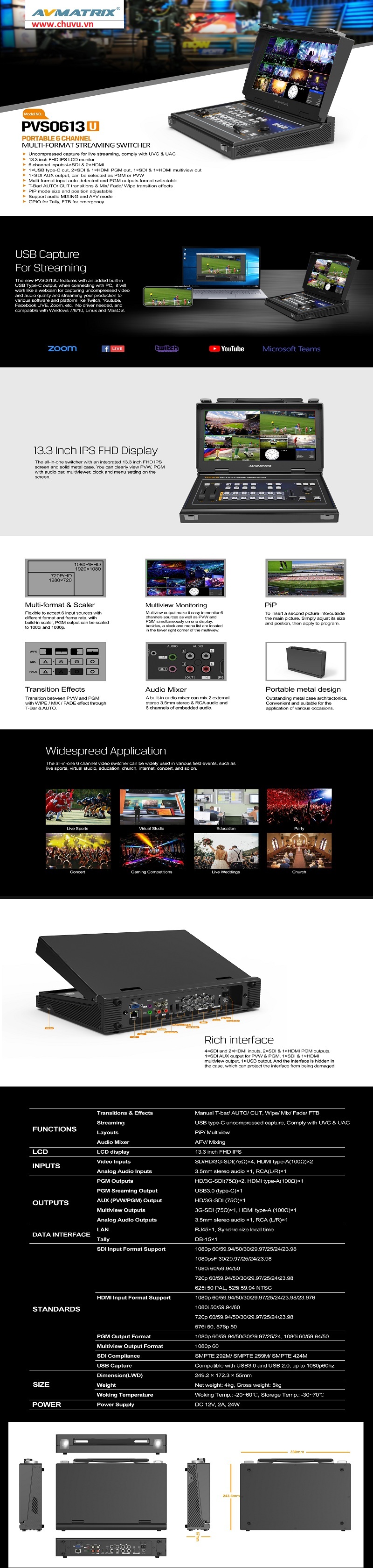 Bộ Trộn hình đa định dạng 6 input Video: 4 input SDI và 2 input HDMI PVS0613U có chức năng capture bằng cổng Type C.