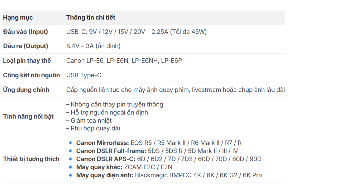Dummy Battery DB-E6P USB-C thay thế pin Canon LP-E6P cấp nguồn máy ảnh DSLR hoặc Mirrorless Canon EOS