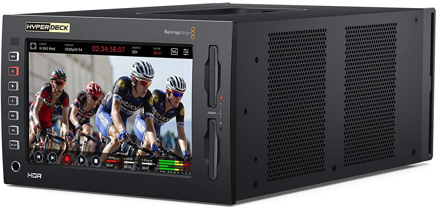 Việc hỗ trợ thẻ CFast cho phép bạn ghi nội dung ở tốc độ cao. Các file H.265 đủ nhỏ để cho phép bạn ghi 8K lên các thẻ CFast tiêu chuẩn. Ngoài ra, với hai slot thẻ, bạn có thể thay thẻ đã đầy khi thẻ kia đang ghi, cho phép ghi trong thời gian vô tận. Thẻ CFast là loại hoàn hảo cho truyền hình vì chúng nhỏ, có tốc độ cao và giá cả hợp lý. Bạn thậm chí có thể dùng Blackmagic MultiDock 10G để ghi nội dung lên ổ cứng SSD. VỚi H.265, bạn có thể ghi 498 phút nội dung 8K60p lên một thẻ nhớ 1TB, 1059 phút ở 2160p60 ultra HD và 2354 phút ở 1080p5994 lên một thẻ nhớ 1TB. Tương đương với hơn 8 tiếng ở 8K và 39 tiếng ở HD.