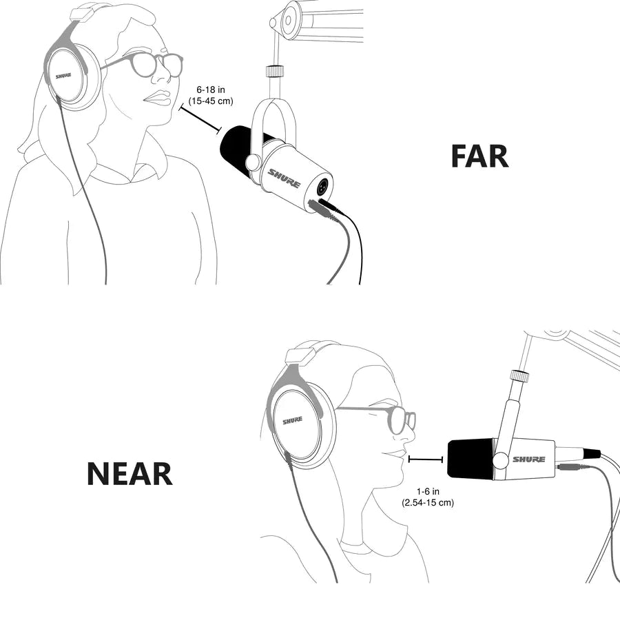 Đối với việc podcast và ghi âm giọng nói, hãy đặt Micro thu âm Shure MV7 USB ở phía trước và gần mặt bạn nhất có thể. Nói trực tiếp vào micro, giữ khoảng cách từ 1-6 inch (2,54 - 15 cm) để có âm thanh giọng nói thân mật hơn và giảm tối đa tiếng ồn lệch trục.