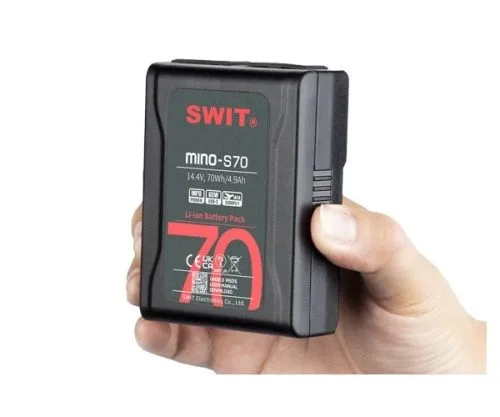 Pin SWIT MINO-S70 là pin gắn chữ V cỡ nhỏ bỏ túi dành cho máy ảnh cầm tay, màn hình và các thiết bị máy quay khác. Nó cung cấp năng lượng cho RED V-raptor trong ít nhất 1 giờ và cung cấp trọng lượng tối thiểu để lắp đặt bộ ổn định.