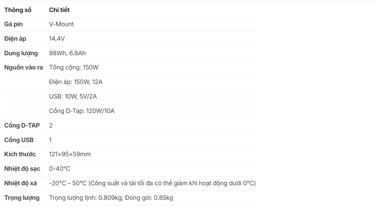 Sản phẩm được hãng trang bị bao gồm 12 cell pin 18650 cao cấp, điện áp danh định là 14,4V và đạt công suất cao 98Wh/6,8Ah. Do đó, thời gian của pin có thể chạy khoảng 3 giờ đối với máy quay thông thường, cho tải cao ít nhất 150W/12A ngay cả ở mức công suất 1%.