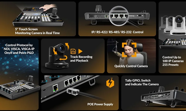 - Cần điều khiển 4D chuyên nghiệp: Mang đến khả năng điều khiển camera PTZ linh hoạt, chính xác đến từng milimet. Bạn có thể dễ dàng điều chỉnh góc quay, nghiêng, phóng to/thu nhỏ (pan/tilt/zoom) và lấy nét một cách mượt mà, chuyên nghiệp.